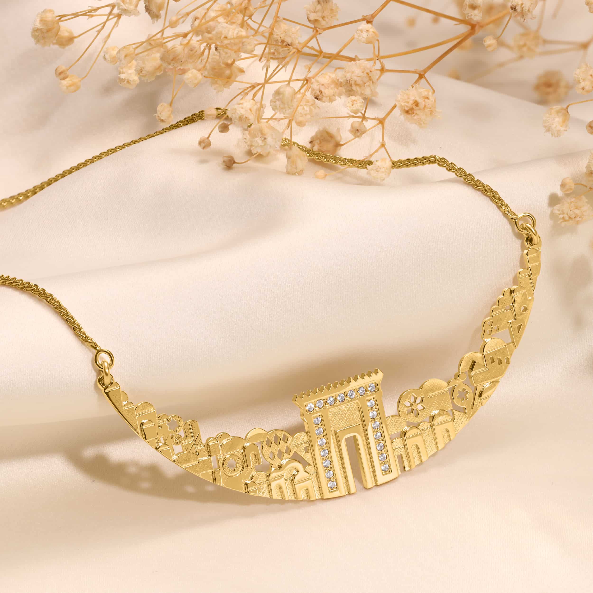 במרכז התכשיט נמצא דגם ההיכל המשוחזר של בית המקדש השני בירושלים. וסביבו אלמנטים אדריכליים של ירושלים למגוון תקופותיה.